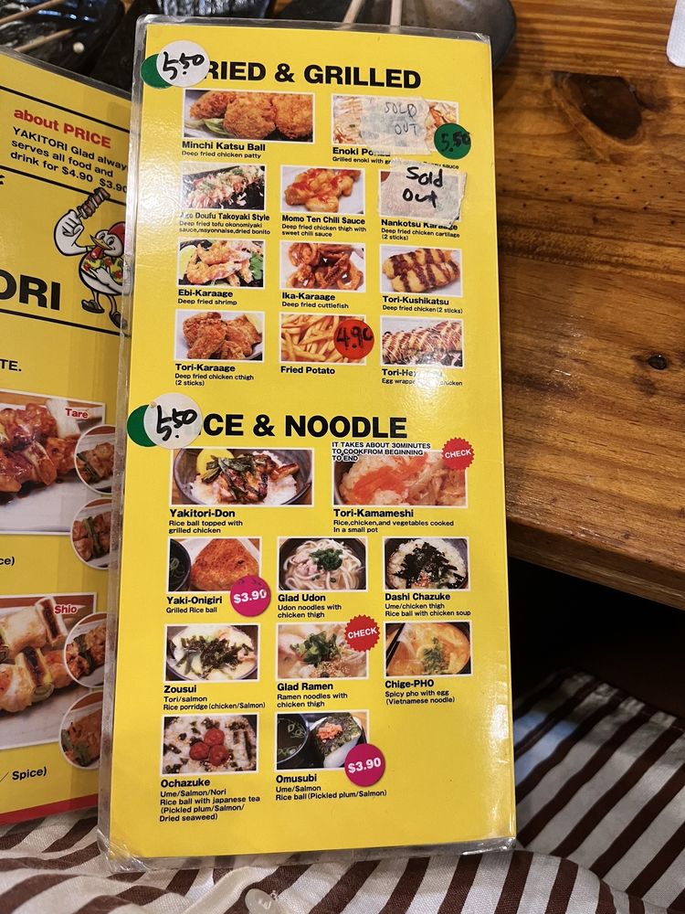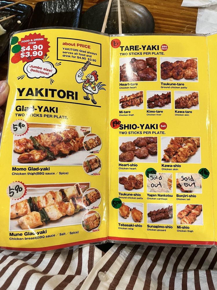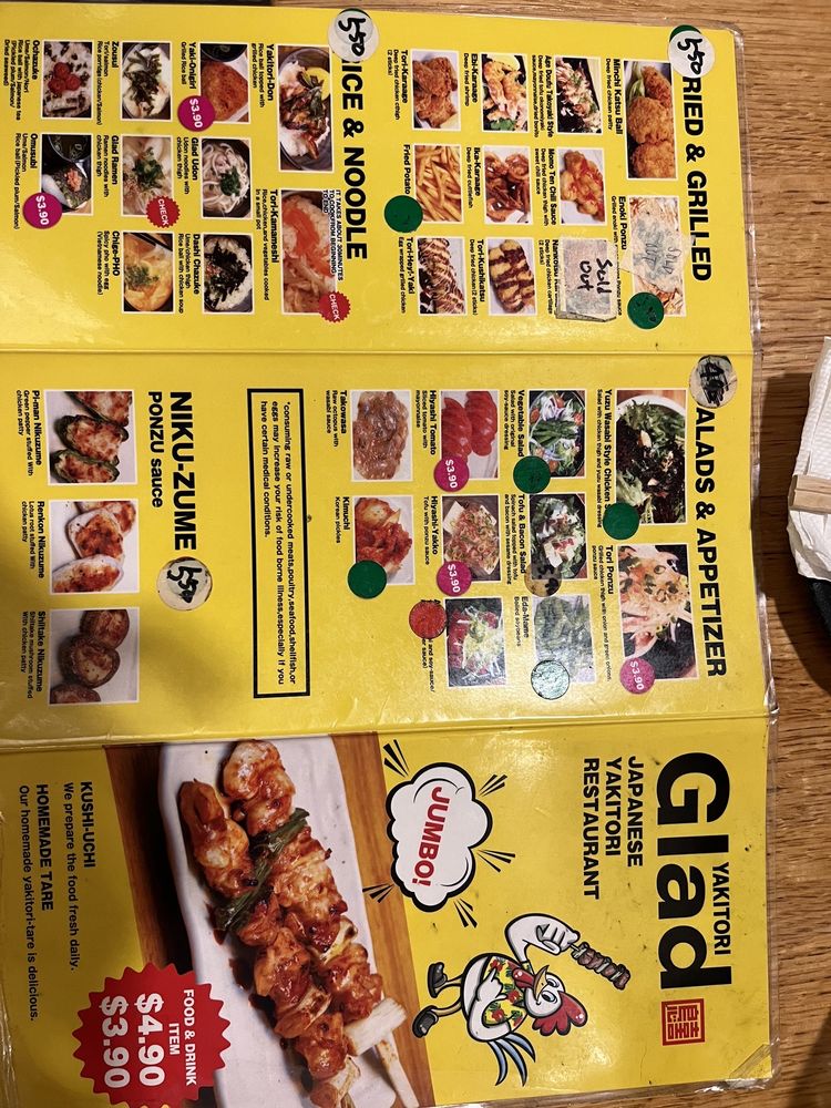 Introducing the menu at Yakitori Glad, an Izakaya located at 766 Kapahulu Ave in Honolulu, HI. This restaurant offers a warm and inviting atmosphere with friendly staff that will make you feel like you're in Japan. Customer reviews praise the great food and affordable prices, with options like juicy chicken hearts, flavorful steak, and spicy kimchi tako. The menu includes delicious items such as yuzu beef skewers, garlic and Pirikara Menma, and Okonomiyaki fries. Diners can enjoy unique dishes that come in pairs, perfect for sharing in groups of 2-6. The restaurant provides a full bar, happy hour specials, and outdoor seating. With fast service and a variety of options to choose from, Yakitori Glad is a must-visit for a delicious and fun dining experience.